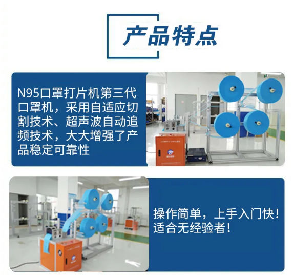 N95口罩機【第三代增強穩(wěn)定型】 型號:LB-MMN95-3.0 產(chǎn)量:40-70片/分鐘,6-10萬片/天 電壓:220V 功率:3300W 尺寸:2.6*0.9*1.8M 重量:200KG 層數(shù):4層,裝配式機架,方便增加卷盤,可以支持5層,6層 設(shè)備組成: N95口罩打片機(含鼻梁條機) N95口罩封邊機 N95口罩耳帶焊接機