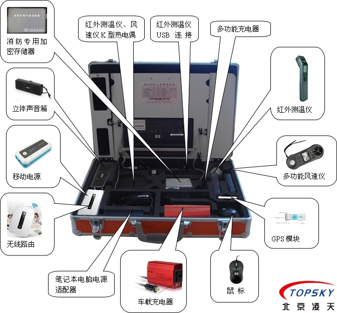 整套設備包括:筆記本電腦、紅外測溫儀、多功能風速儀、GPS模塊、消防專用加密存儲器、立體聲音箱、無線路由器、電源系統、鼠標、車載充電器、移動電源、筆記本電腦適配器、便攜箱、防水迷彩袋;