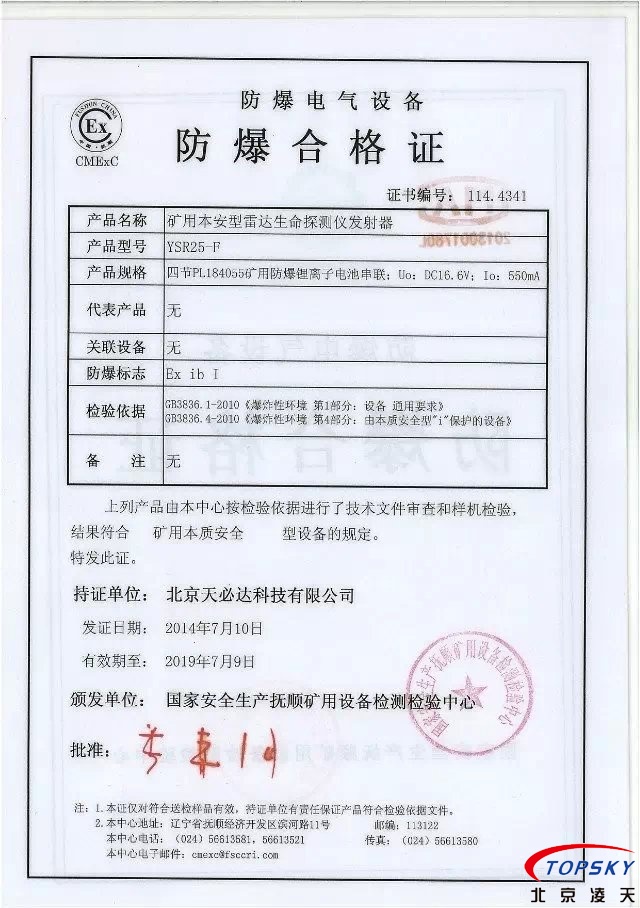 從國家安標中心獲悉,YSR25本安型雷達生命探測儀取得煤安標志認證(證書見下圖),自此,國內本安型可用于爆炸性環境的探人雷達取得完整下井資質,從研制方獲悉,該設備已在山西陽泉煤業集團救護大隊、山西潞安集團救護大隊、開灤集團救護大隊進行過工業性試驗,試驗效果良好,探測距離達到25米(報告見下圖)!