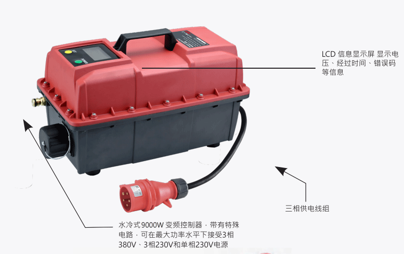 2、水冷式9000W變頻控制器,帶有特殊電路。可在最大功率水平下接受3相380V、3相230V和單相230V電源。
