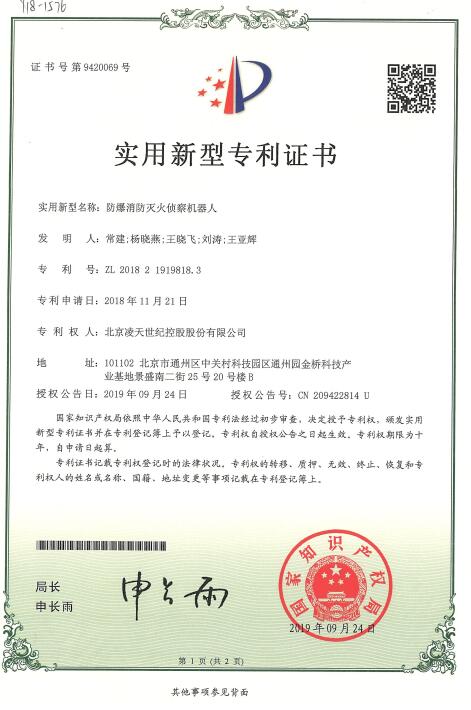 獎項類2019獲得第一屆安全科技進步獎防爆消防滅火偵察機器人