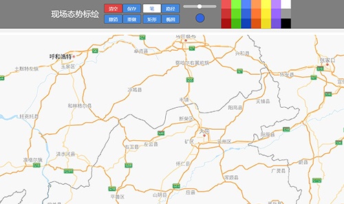 現場態勢標繪,可進入到地圖中,進行線路的制作、路徑、矩形、圓形等操作選擇,及可對操作步驟進行撤銷及畫筆的顏色選擇