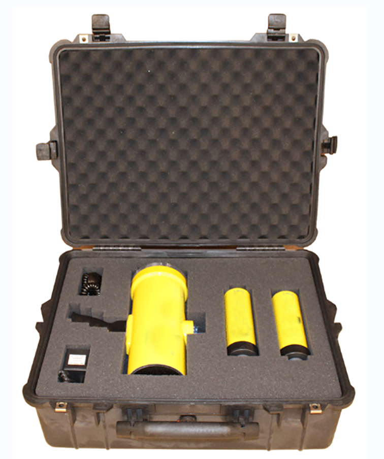 手持聲納設備為便攜式、組合式的聲納系統,由聲吶發射器和聲吶接收器兩部分組成,可實現發射和接收的操作。聲吶發射器可為潛水員在水下定位水下物體。工作深度100m,頂部帶有指南針,方便在水下辨別方向, 整體為醒目的亮黃色,接收器帶有槍式握把,潛水員可單手操作接收器。