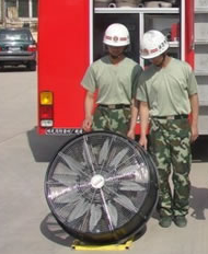 適用于有進風和出風的火場建筑物,利用排煙機的正壓把新鮮空氣通過建筑物進風口吹進建筑物內,把煙霧從建筑物內吹出,清除火場煙霧,使消防員能夠進入建筑物內的火場進行滅火。根據需要可以調節(jié)風扇的出風口的角度和風扇的轉速. 利用高壓水作動力,驅動水動機運轉,帶動風扇排煙, 具有防爆功能,重量輕,移動方便.