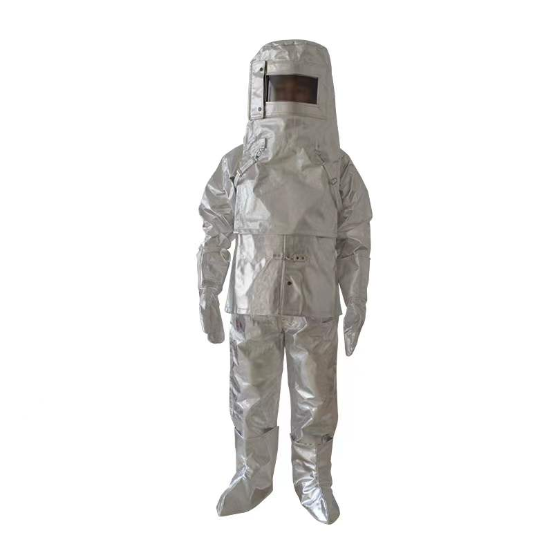 該服裝由鋁箔耐高溫隔熱布、阻燃隔熱:層及舒適層組成,具有耐磨、隔熱、抗輻射熱等性能。基布面料不含石棉、玻璃纖維,具有重量輕、耐高溫、耐折以及對人體無毒害等優點,能有效地保障消防隊員和高溫作業人員不被烈焰、高溫灼傷。是消防隊員在火場及高溫事故現場進行搶險作業的理想防護服裝。