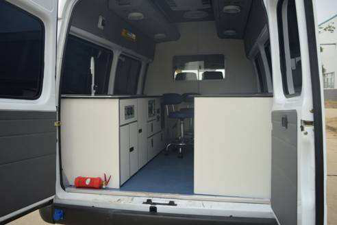 2) 車內工作臺面采用雙面覆膜優質實芯理化板,耐強酸強堿,防水,防腐蝕,耐刮,耐磨,耐抗擊,不變形,無毒,易清潔。