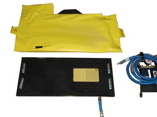 2種規格(旋轉扣型,重量25kg,帶子導向扣型,重量16.9kg),密封面積50×30厘米,軟橡膠材質,配有快速充泄氣切換接口,1個帶安全壓力表的腳踏高壓氣泵。適用于在地形復雜的狹窄空間內密封直徑在5至48厘米的管道及圓形容器的裂縫。